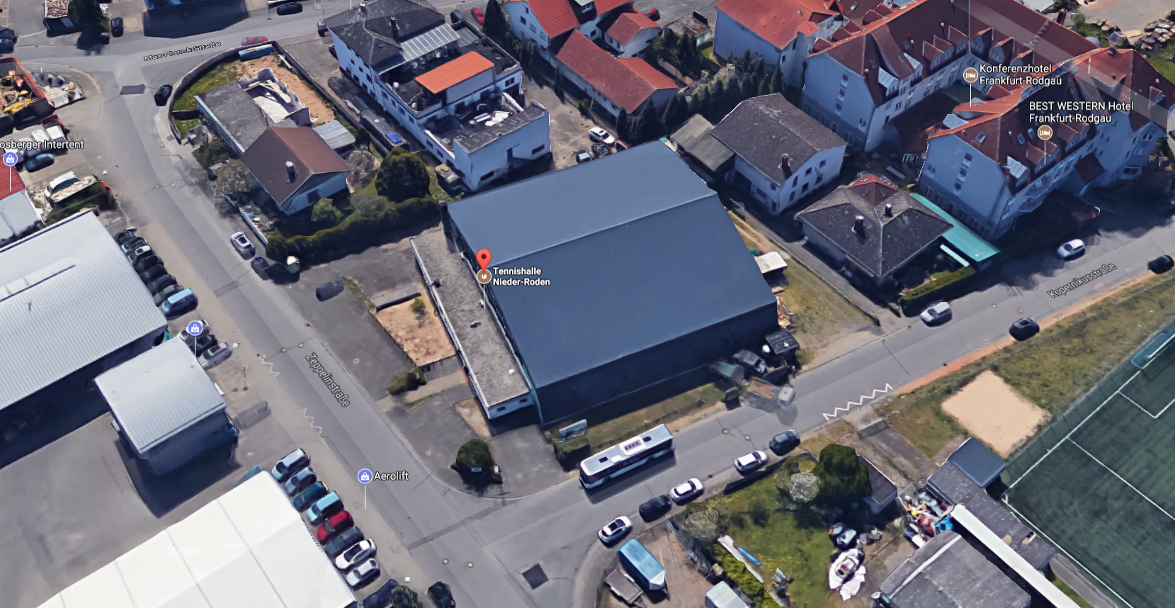 Die Halle befindet sich in unmittelbarer Nachbarschaft der Außenanlage am östlichen Ortsrand von Nieder-Roden.